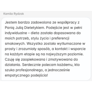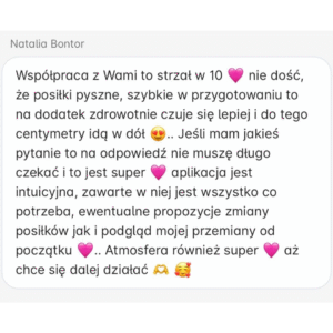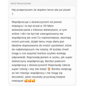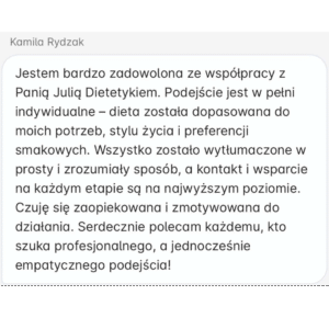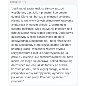 Indywidualna dieta, plan suplementacji i raporty co 2 tygodnie ze stałym kontaktem z dietetykiem klinicznym.